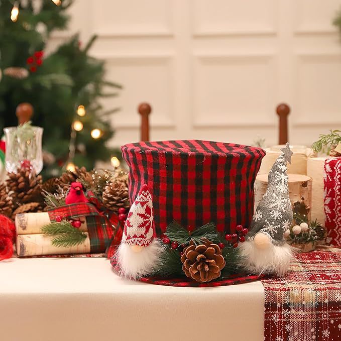 人気のクリスマスツリーの頂部用帽子、星型、赤と黒の格子柄のツリーの頂部装飾帽子、ホリデーホームデコレーション、圧縮可能なツリーの頂部帽子