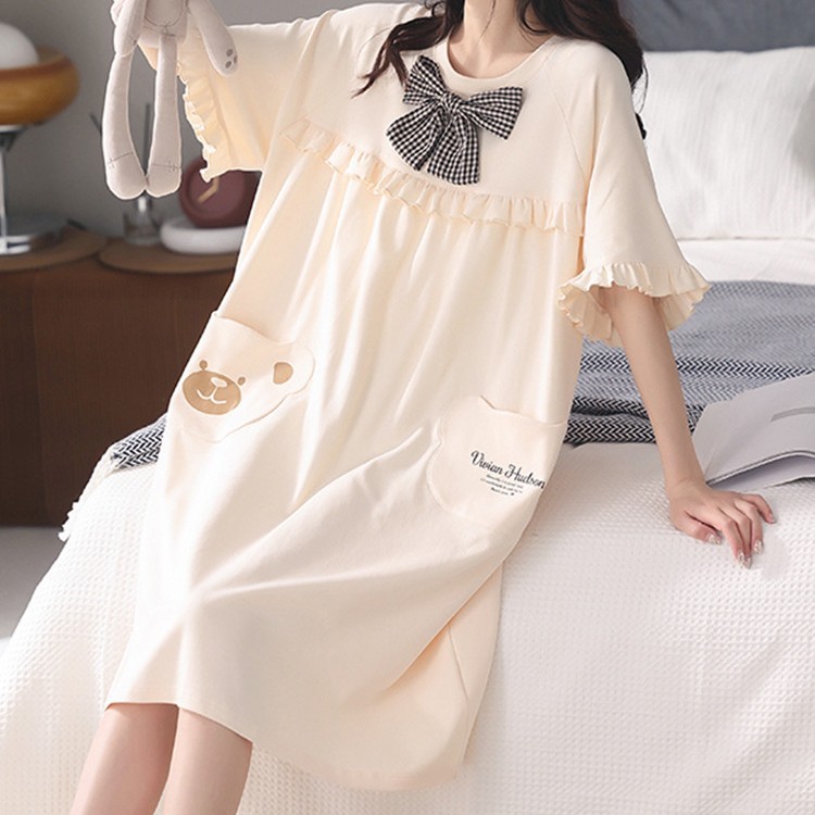 薄いパジャマ女性の夏の純粋な綿半袖ルーズ漫画ネグリジェラウンドネック大きいサイズ韓国語版かわいい学生