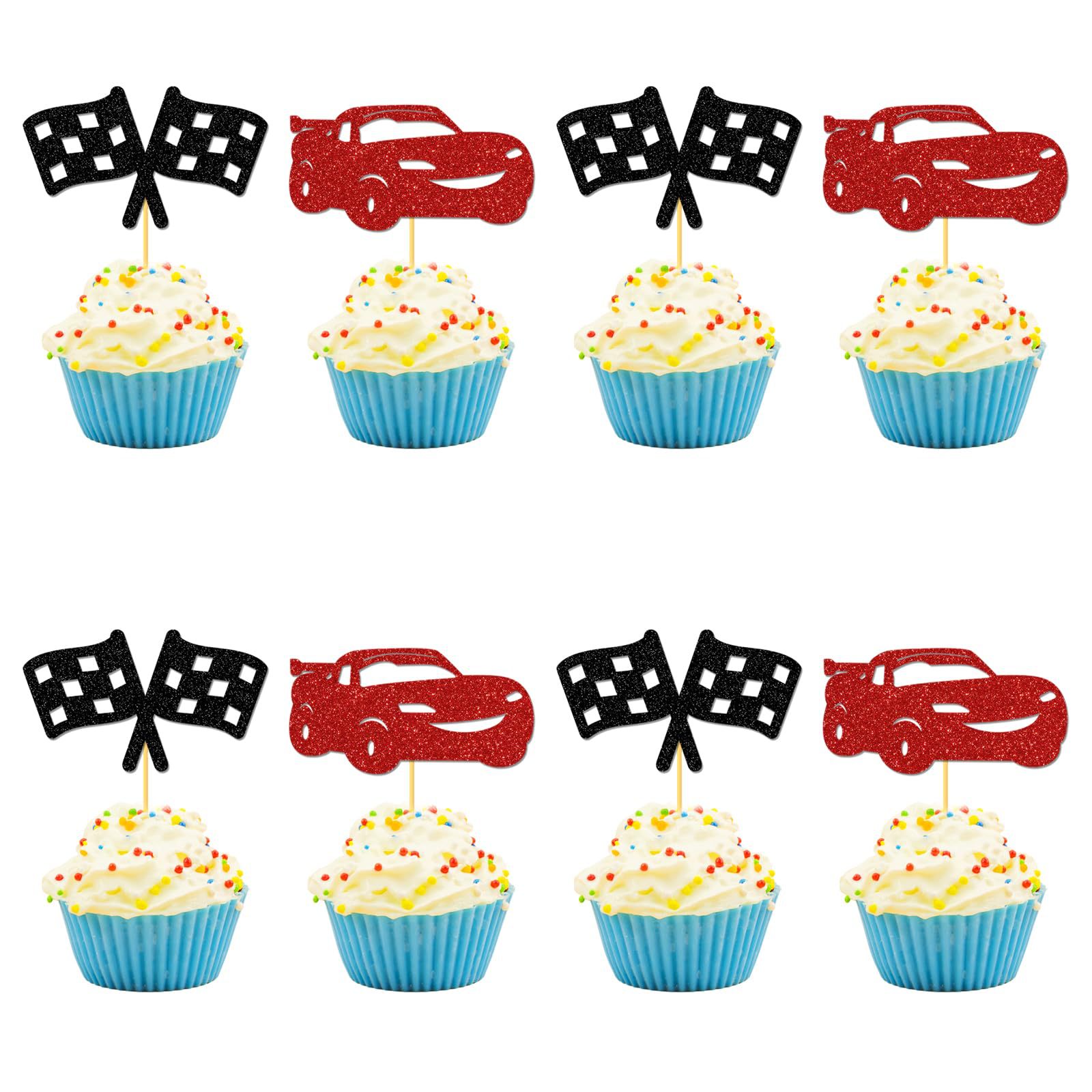 24 個レッドカーケーキインサートカードインサートデコレーションレーシングパーティーデコレーションチェック柄テーマ男の子女の子ベビー