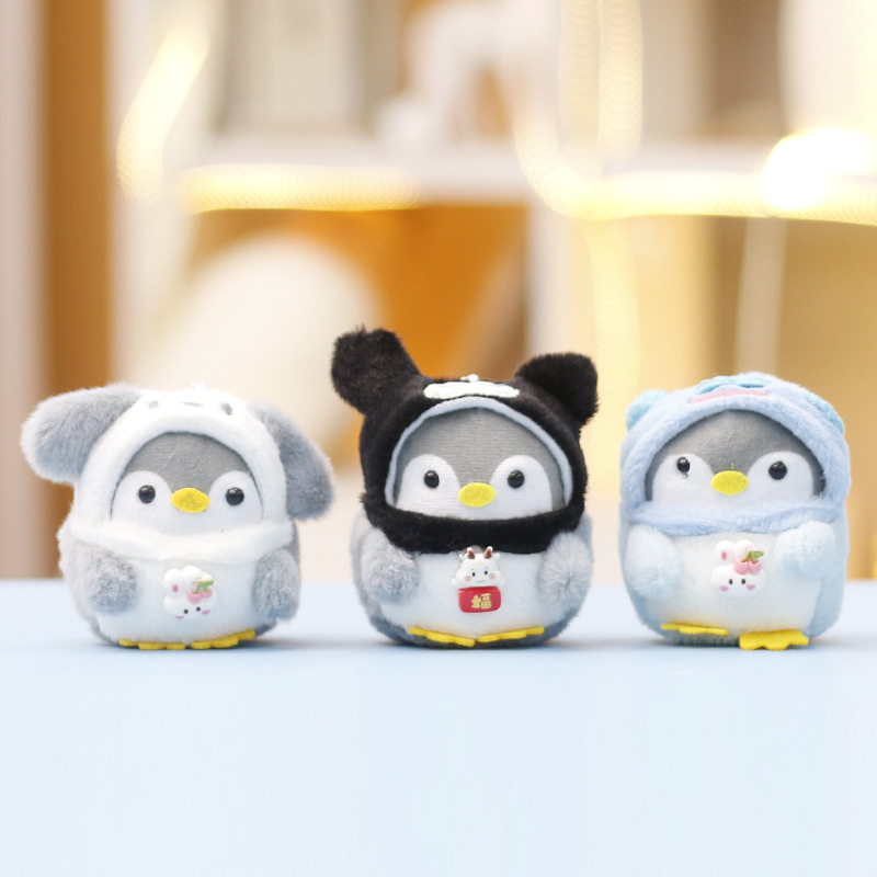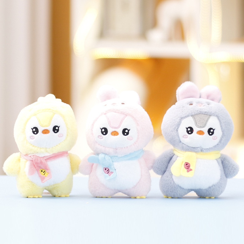 ぬいぐるみのペンギンがウサギのぬいぐるみを変装したかわいい人形のバッグに飾られた人形のキーホルダーのペンダントが商品を集めた