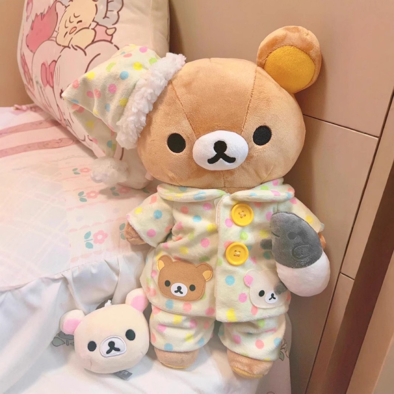 震え音の同じタイプの拉熊が寝ているリラックマのパジャマのぬいぐるみはかわいい人形の誕生日プレゼントの女性を取り外します