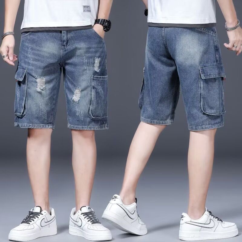 夏用薄手リップドデニムショートパンツメンズトレンディブランドハンサムマルチポケットオーバーオールルーズストレート5分丈パンツ