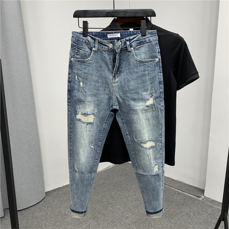 メンズリップドジーンズトレンディブランド2024夏新作スリムフィット小足ハンサムトレンド万能カジュアル9点パンツ