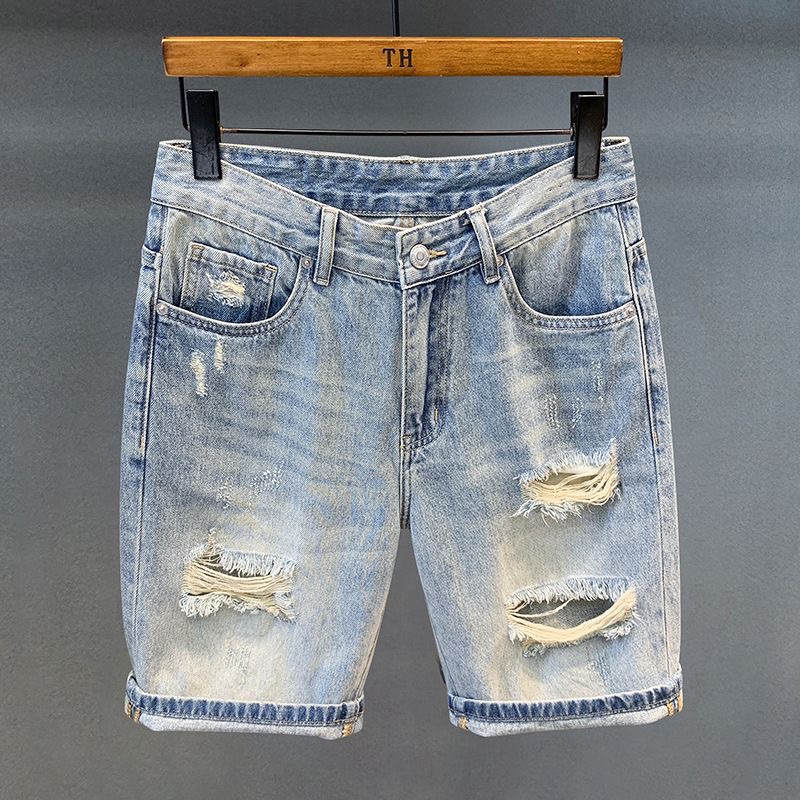 メンズ夏新作トレンドブランドリッピングデニムショートパンツ、ルーズストレート5点パンツ、ハーフキュロット、ミドルパンツ