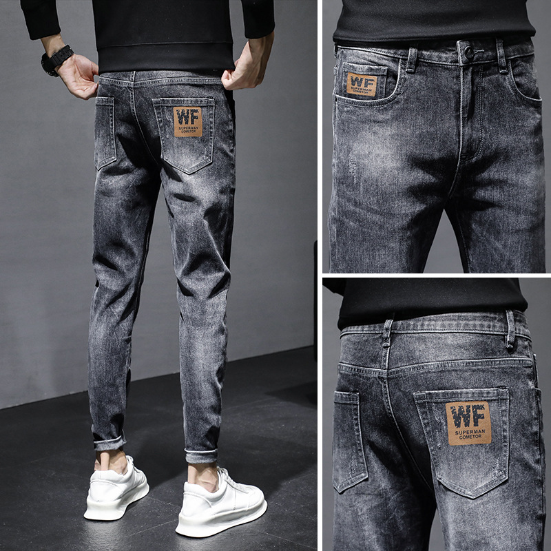 トレンディなブランドスモークグレージーンズメンズ 2023 春と秋の新作ストレッチスリムフィット小足多用途カジュアルロングパンツ