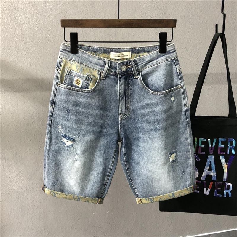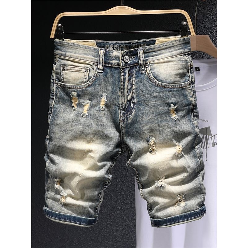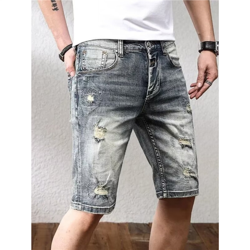 レトロダメージデニムショートパンツメンズ2024夏薄い穴パッチトレンドストレッチスリムトレンドブランド5点パンツ