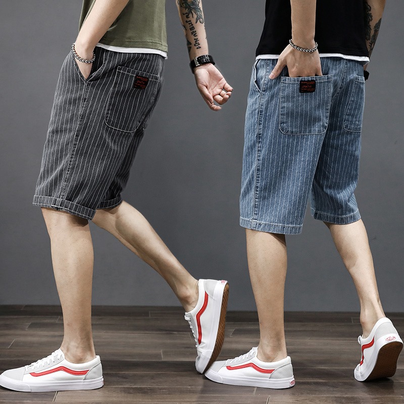 ストライプデニムショートパンツメンズ夏新作ルーズ日本製レトロストレッチミッドパンツトレンディで多用途なハンサムな5点パンツ