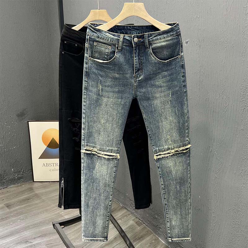 春と秋のメンズジーンズ 2024 新しいスリムフィット小足パーソナライズされたリッピングパッチハンサムで多用途なカジュアルパンツ