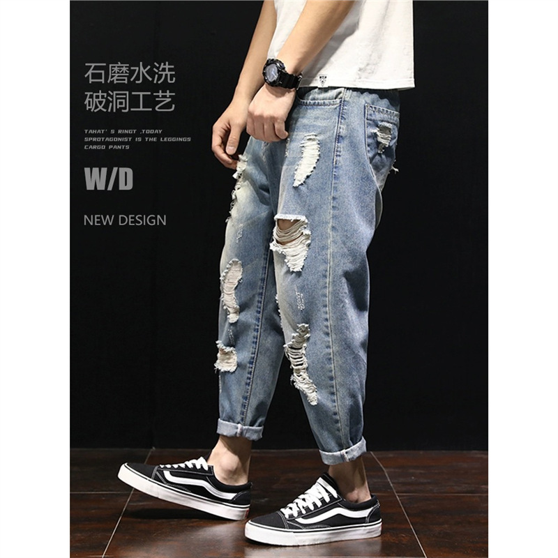 メンズリップドジーンズ2024夏薄手トレンドブランドルーズストレートハンサム万能ウォッシュライトカラーナインポイントパンツ