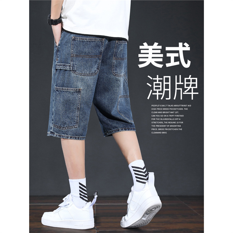 デニムショートパンツメンズ2024夏薄手トレンディブランドルーズストレートアメリカンレトロワークウェアカジュアルミッドパンツ