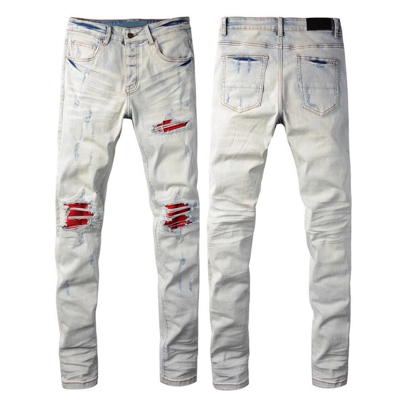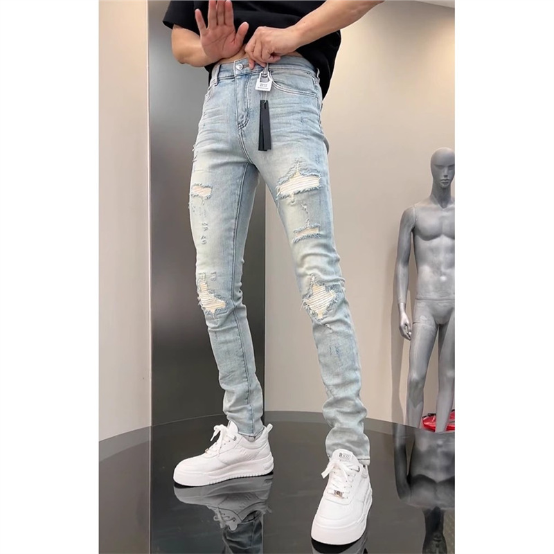 ヨーロッパとアメリカのハイストリートファッションブランドの新しいライトカラーパッチリッピングジーンズメンズスリムフィットハンサムカジュアルロングパンツ