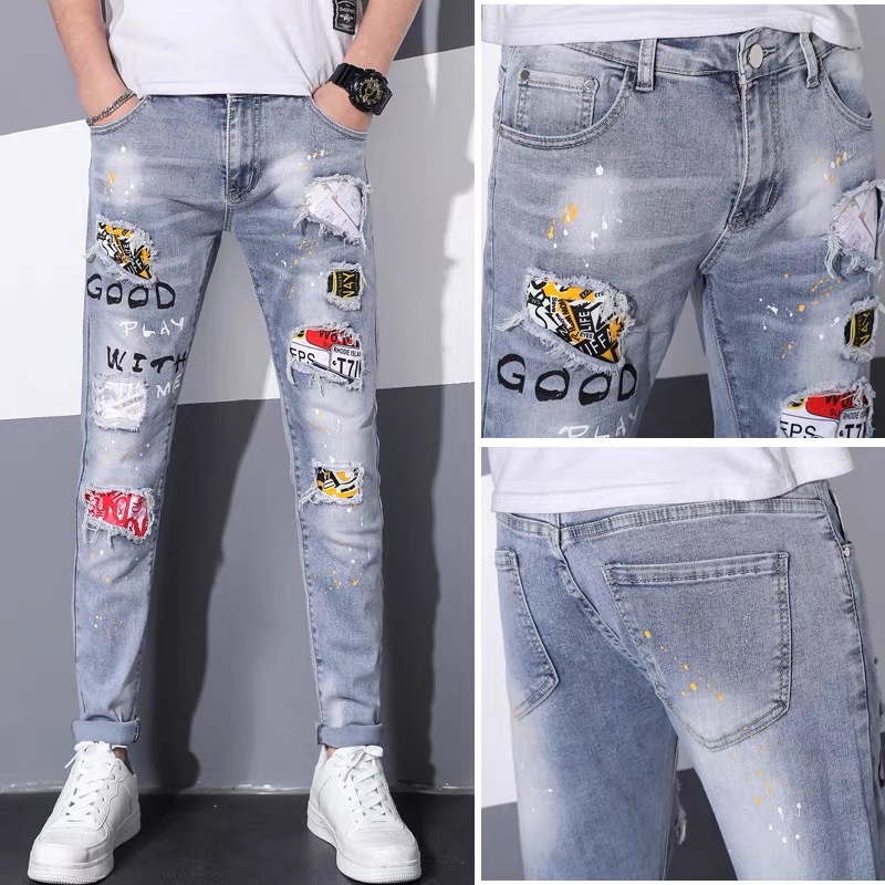 ヨーロッパとアメリカのハイストリートの新しいライトカラーのリップドジーンズメンズトレンディブランドハンサムパッチ弾性スリムフィット乞食パンツ
