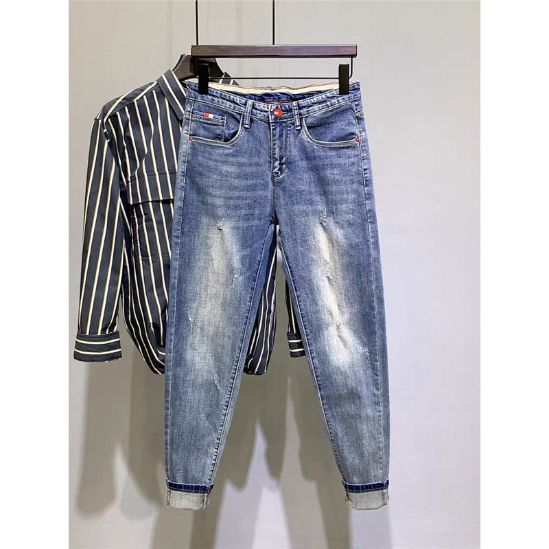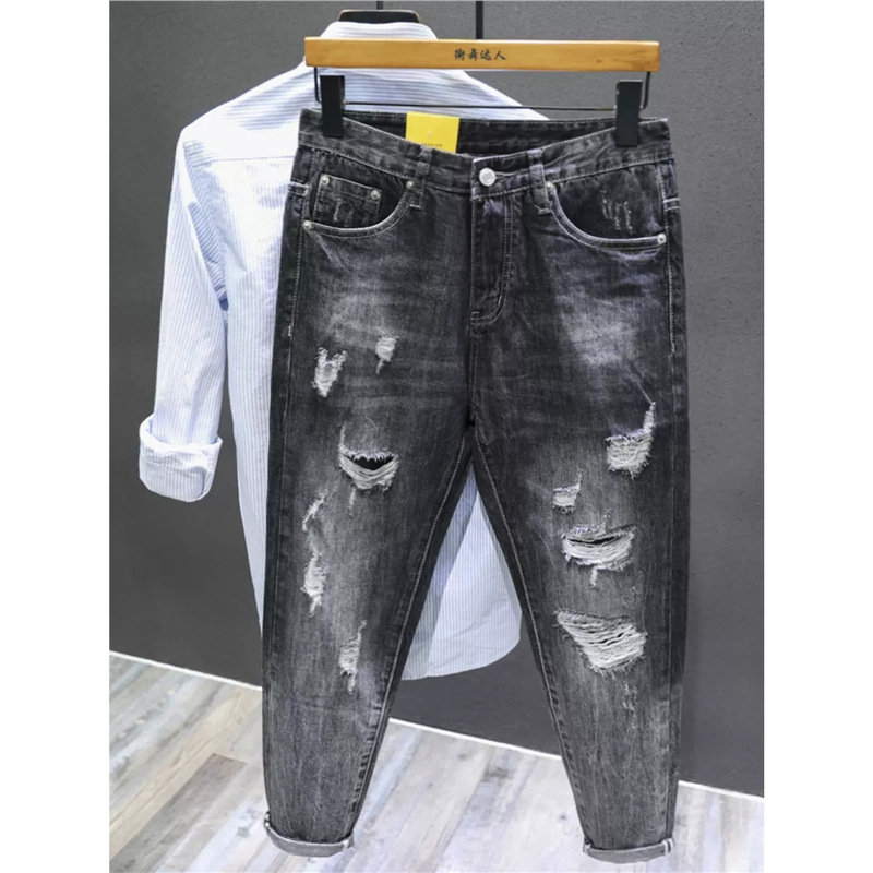 メンズリップドジーンズ、トレンドブランド、夏用薄手スリムフィットパンツ、伸縮性カジュアル、万能乞食風9点パンツ