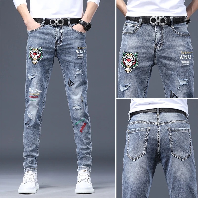 ヨーロッパ刺繍リップドジーンズメンズトレンディブランド2025夏新作多用途カジュアルウォッシュスリムフィットパンツ