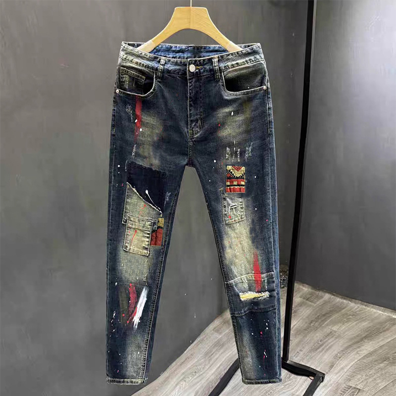 2024年新作メンズジーンズ、春と秋のトレンドブランド、ウォッシュドスリムフィット、トレンディでハンサムなパッチカジュアルロングパンツ