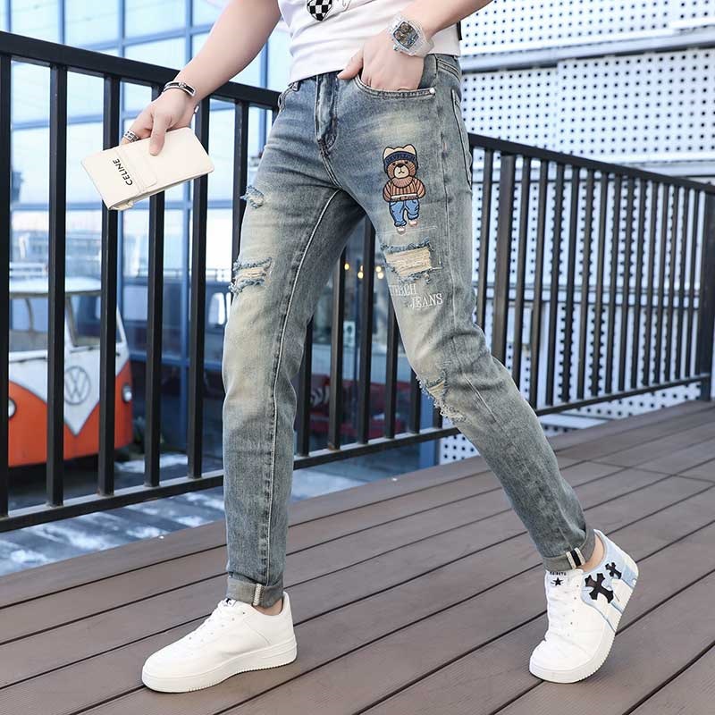 ヨーロッパのハイエンドのトレンディなブランドのクマ刺繍ジーンズメンズ夏の新しいファッションリッピングスリムフィットパンツ