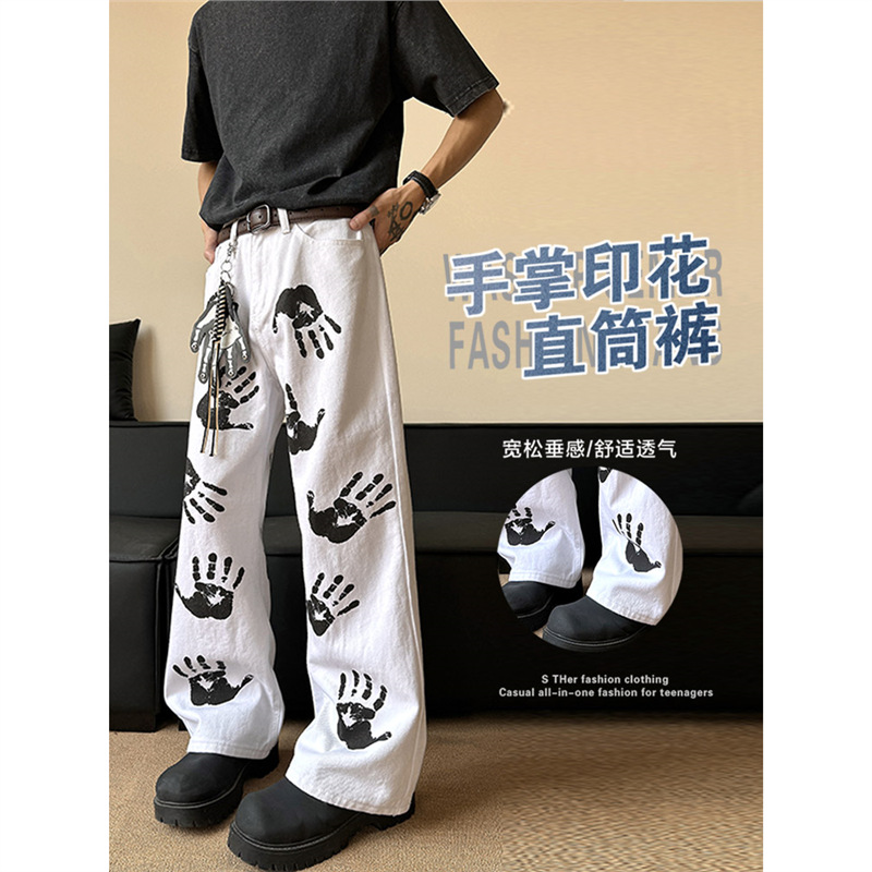 アメリカンハイストリートヒップホップパームプリントストレートジーンズメンズバイブトレンディブランドニッチハンサムルーズマイクロフレアパンツ