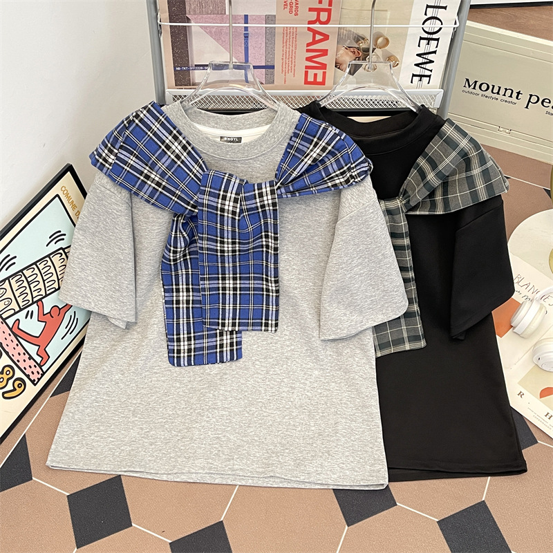 取り外し可能なチェック柄ショール半袖Tシャツメンズ夏アメカジルーズ万能カップル五分袖Tシャツ