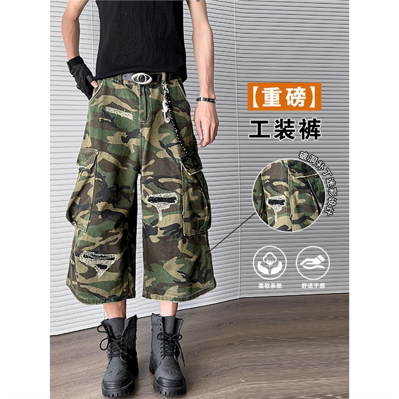 夏ウォッシュド迷彩リップドデニムショートパンツメンズアメリカンヒップホップレトロニッチストレートルーズワイドレッグクロップドパンツ