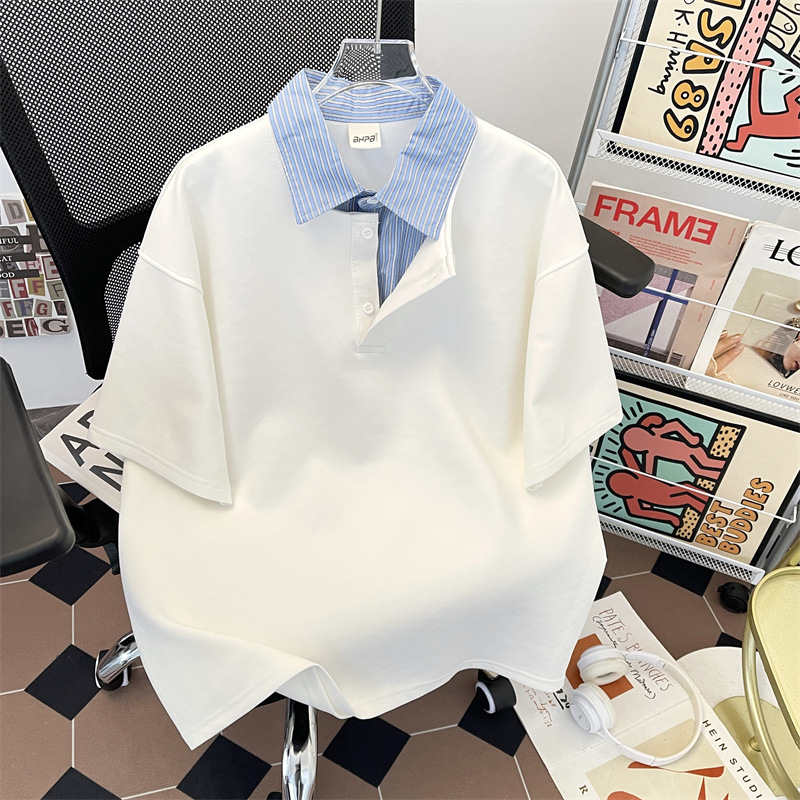フェイクツーピーススプライシング半袖ポロシャツ夏アメリカンレトロルーズカジュアル多用途カップル七分袖Tシャツ