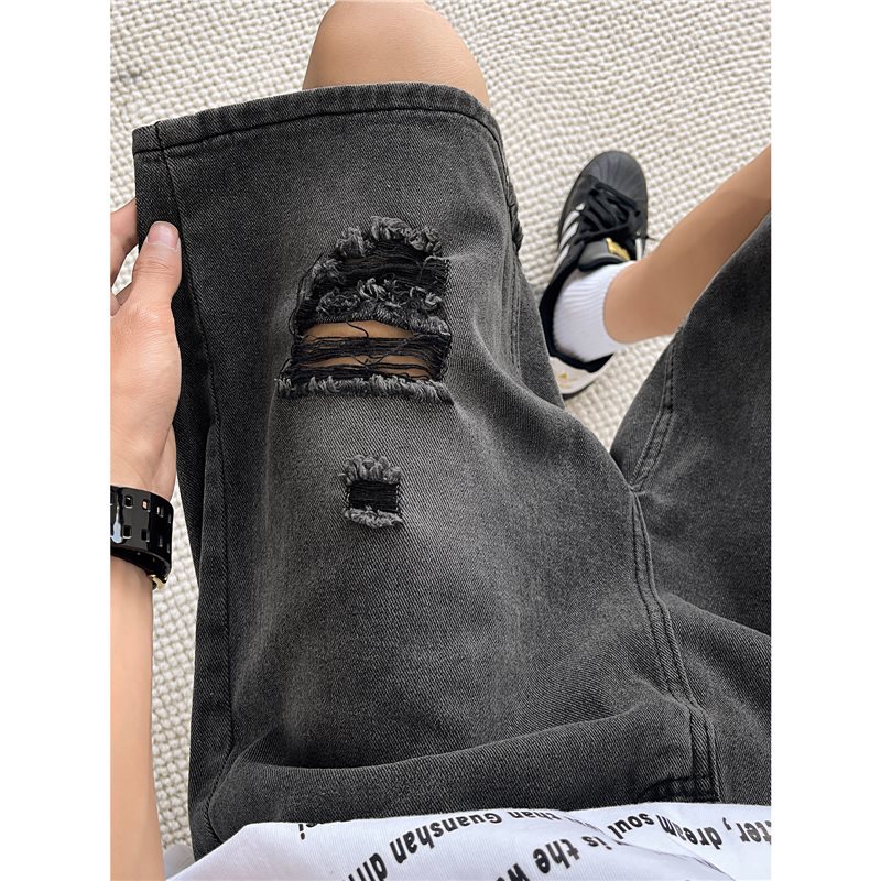 アメリカンレトロウォッシュリップデニムショートパンツメンズ夏トレンディブランドルーズカジュアルダメージストレートワイドレッグ5点パンツ