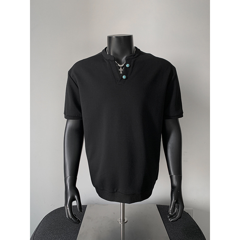 Vネック半袖Tシャツメンズ夏アメリカンボクシーシックブランドハンサムシンプルカジュアルルーズヘンリーカラーソリッドカラートップ