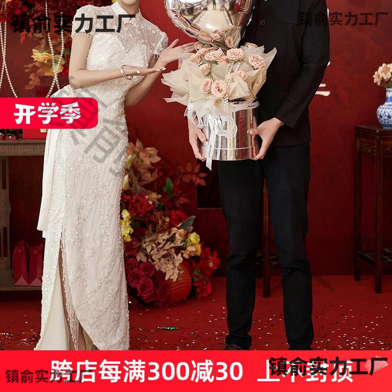 新しい中国風のライトウェディングドレス、ヘビースパンコール、改良されたチャイナドレス、フィッシュテールブライダル婚約ドレス、ホームウェルカムドレス