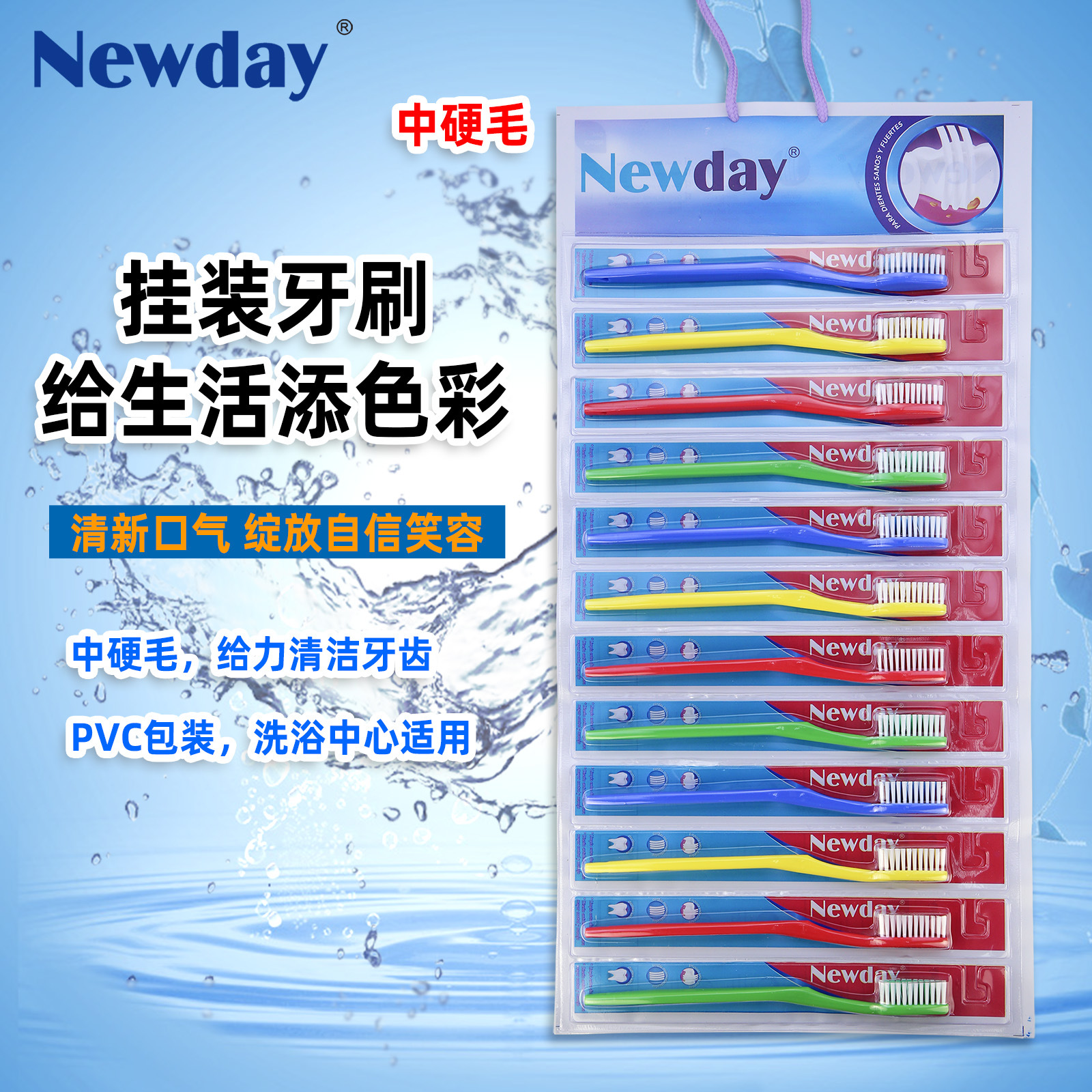 Newdayナイロン毛歯ブラシ家庭用超値装中毛硬毛成人12本掛け英語包装輸出