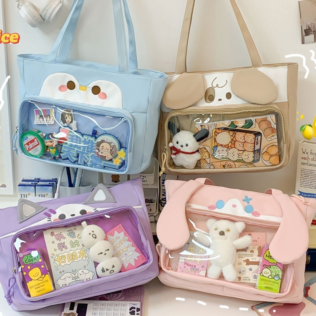 漫画のウサギの食量が大きい、大容量の透明なハンドバッグ、二次元キャンバストートバッグ、女の子のショルダーバッグ