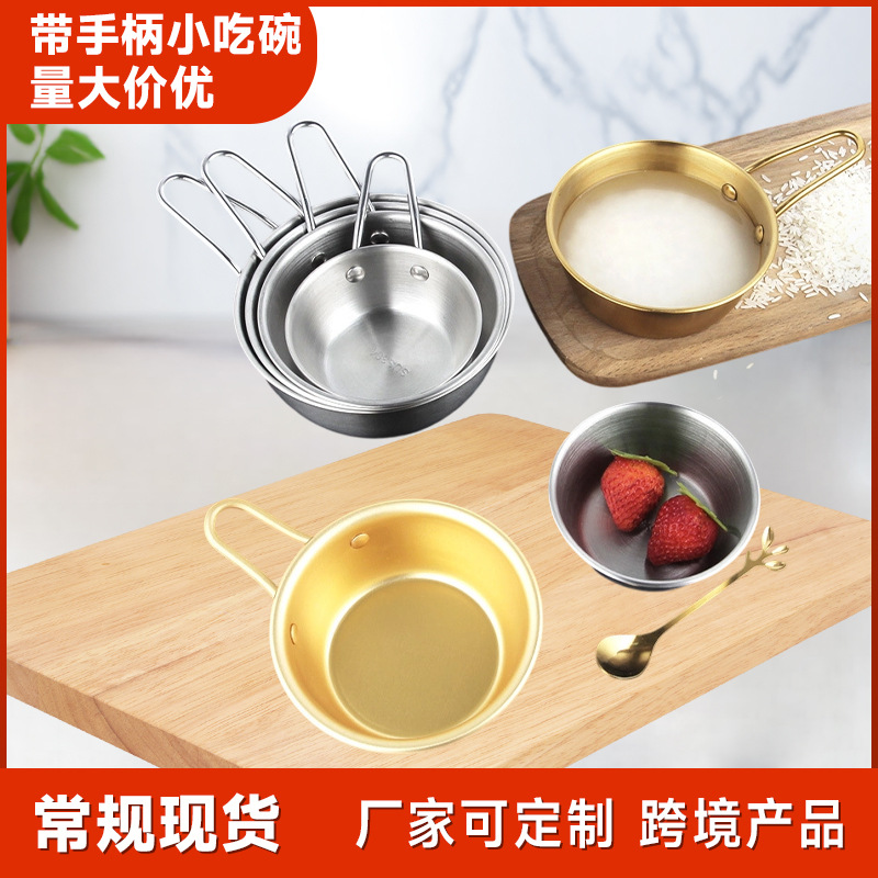 国境を越えた304メートルの酒の碗はハンドルの軽食の碗の多機能の小さい碗の黄色のアルミニウムの韓国式のステンレスの手の茶碗を持ちます。