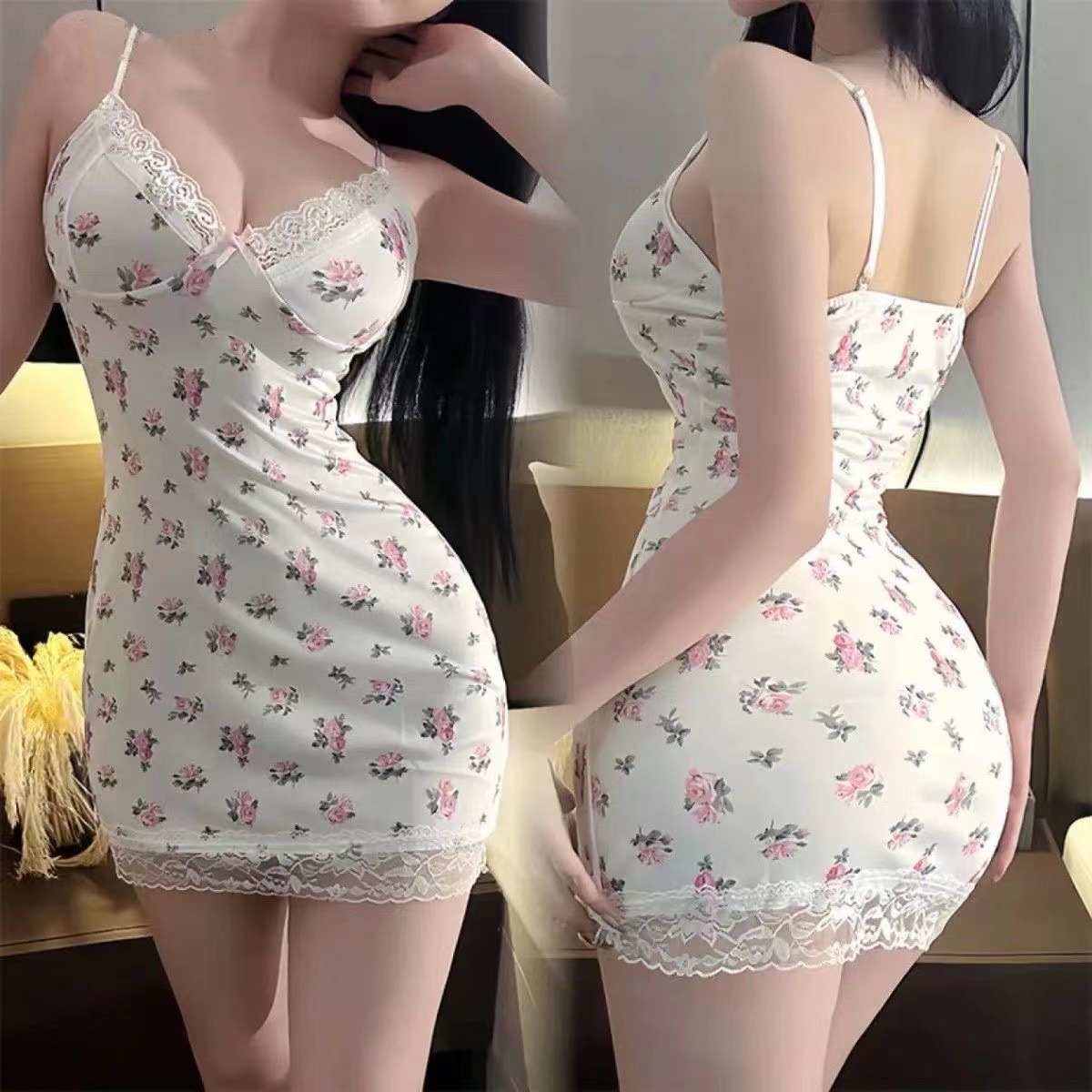 2024ギャルの甘い花のパジャマの女性の新型のレースの修身の薄いタイプの家の服のプリントのレースのガーターの睡眠のスカート