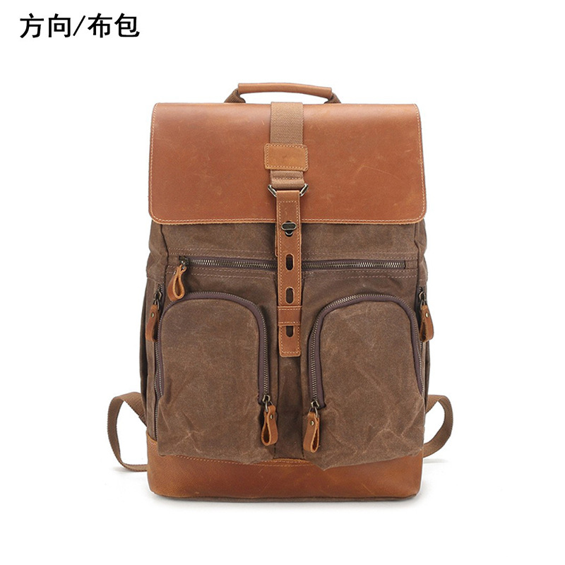 ヨーロッパとアメリカのレトロなオイルワックスキャンバスバックパック対照的な色の大容量アウトドアメンズバッグクレイジーホースレザートラベルバックパックコンピュータブック