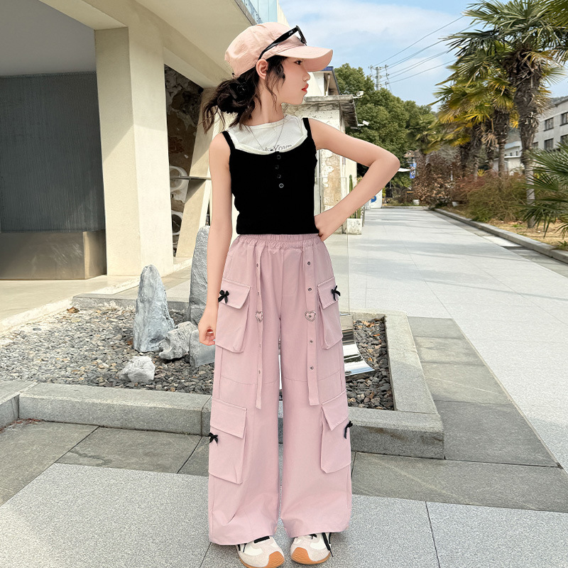 女の子の工装ズボン春夏2025新型子供ネット紅洋気工装広脚ズボンゆるい女の子の街舞ズボン