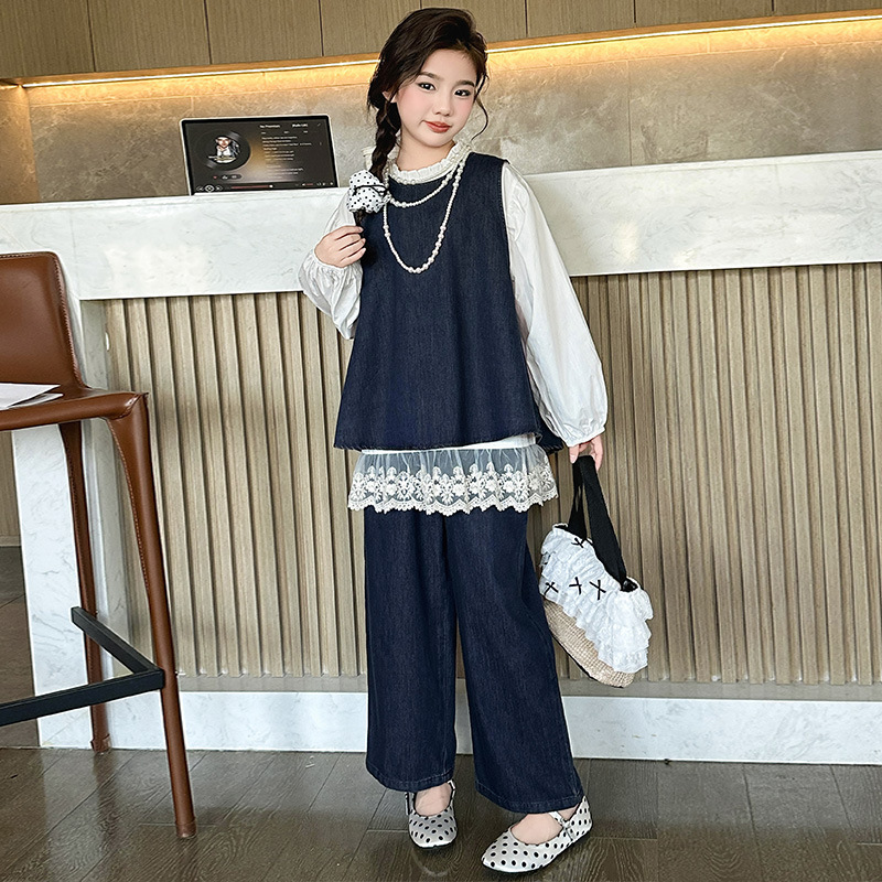 女の子の大きい子供のカウボーイのスーツの春秋の金の2025新型の洋気の流行の初秋の中学生の秋のカウボーイの3つのセット