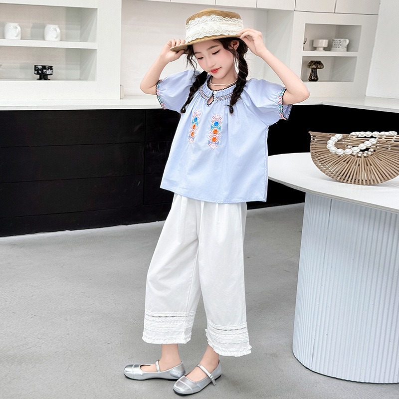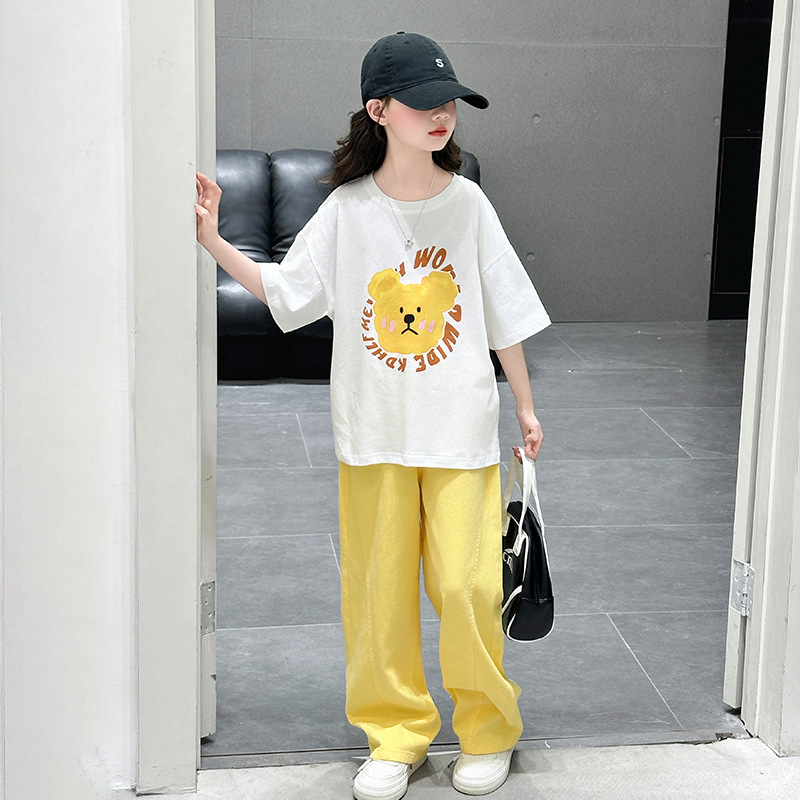 女の子スーツ夏服 2025 新しいファッショナブルな大きな子供薄い半袖子供春と夏のスコビーデニムワイドレッグパンツ