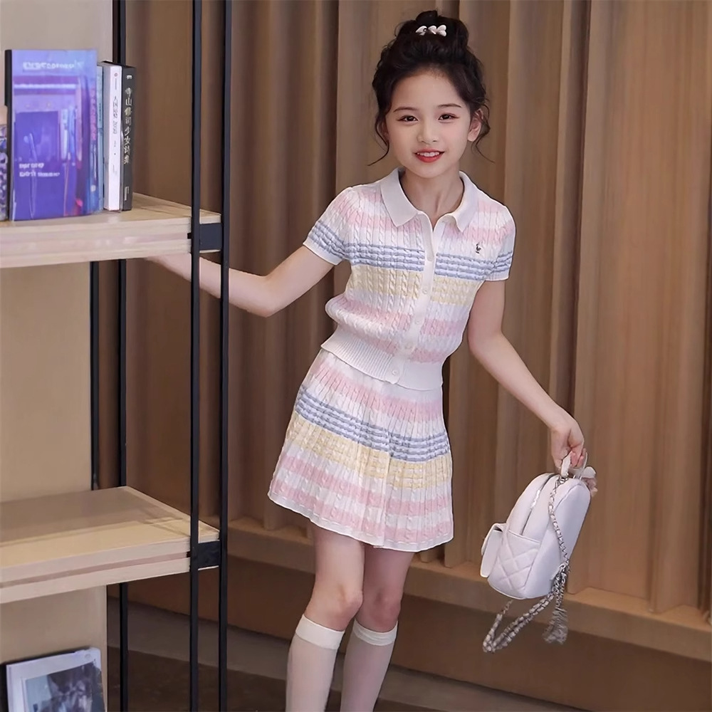 女の子の初夏のニットのスカートの2025の新型のカラーの半袖のカーディガンの上着の子供の百のスカートの洋風の2つのセット