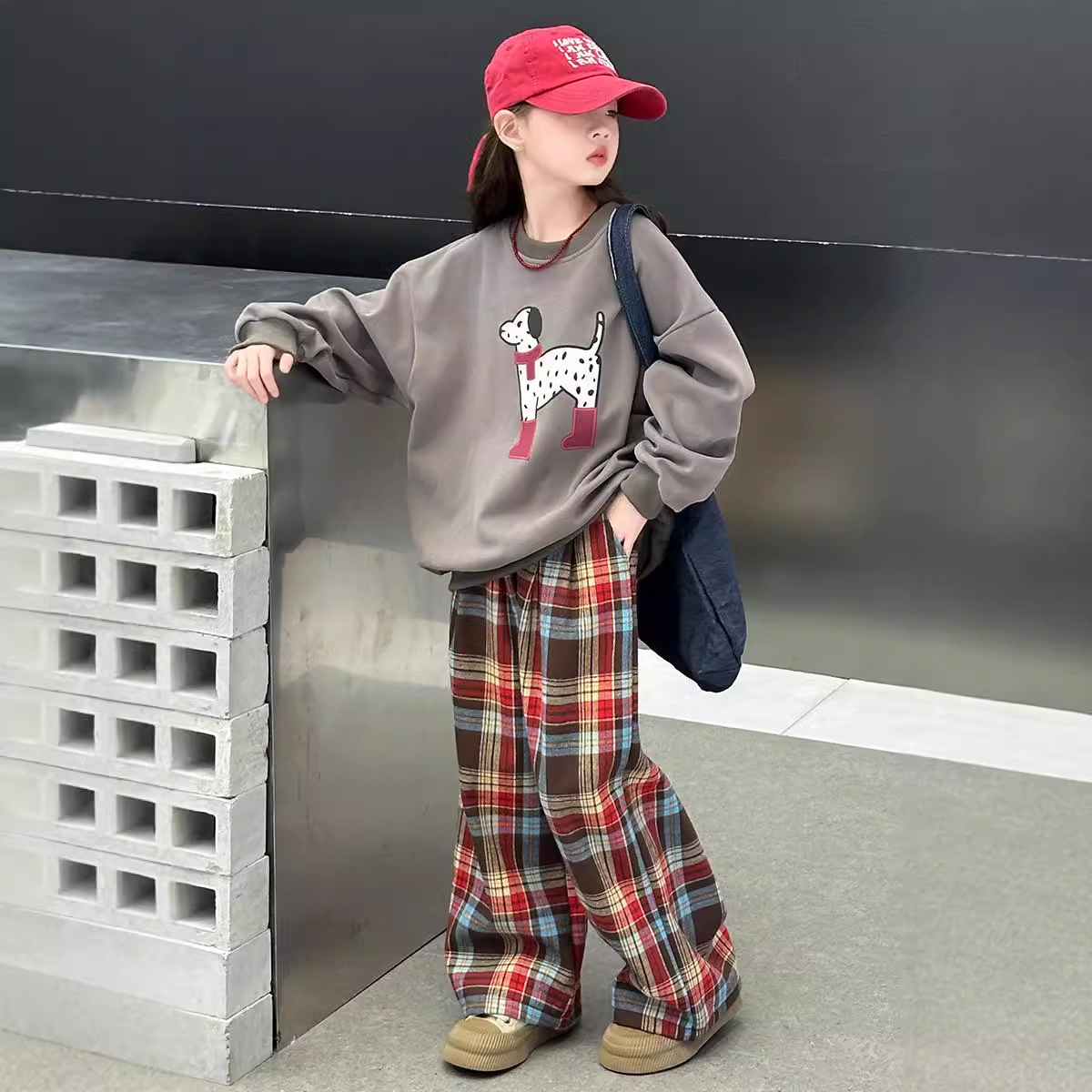 女の子の漫画のガードルの格子縞のズボンのスーツの春秋の2024の新型の中で大きい子供のカジュアルでかわいい丸首の洋風は着ます。