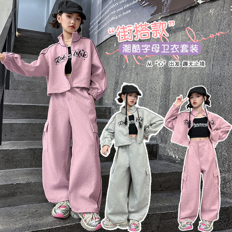 女の子の秋の服装の衛衣のスーツの2024の新型の洋気のレジャーの街頭の運動の短い上着のズボンの2つのセットの潮