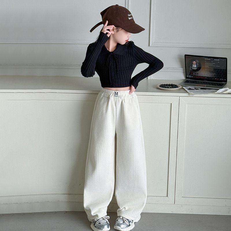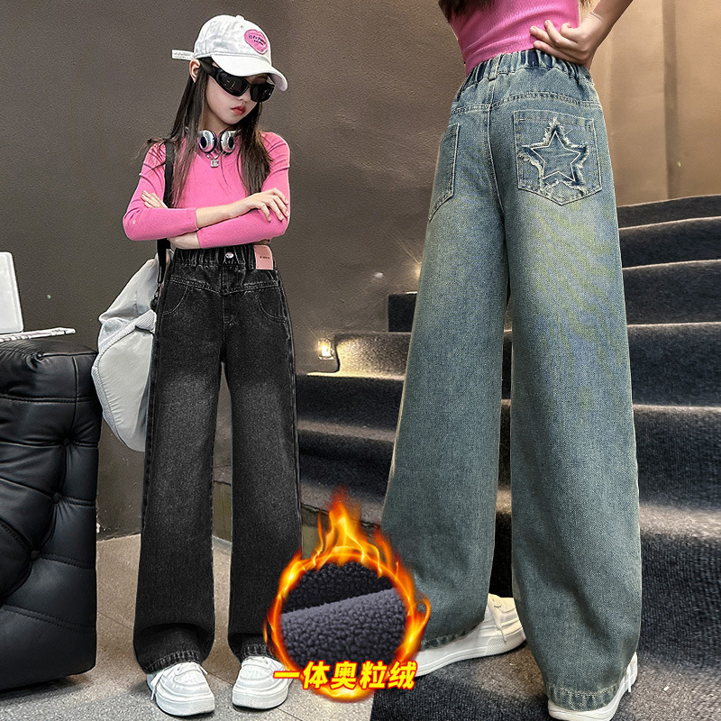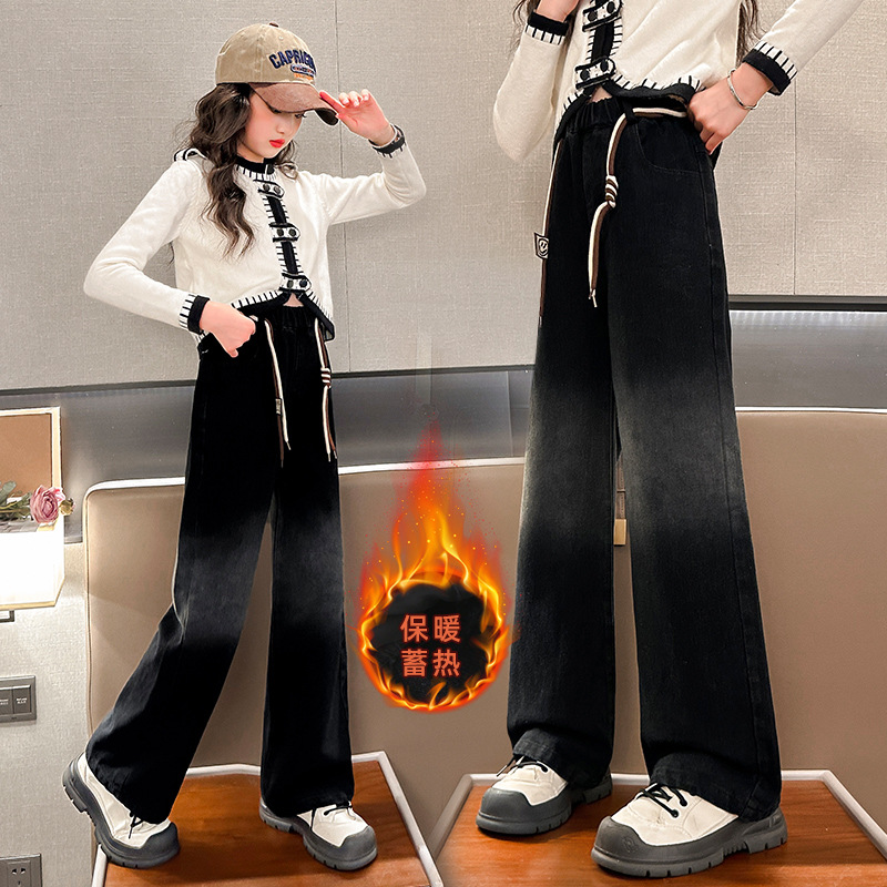 女の子のズボン秋の冬の2024の新型中学生の子供の服の洋風の黒色のベルベットの広い足のデニムのズボン