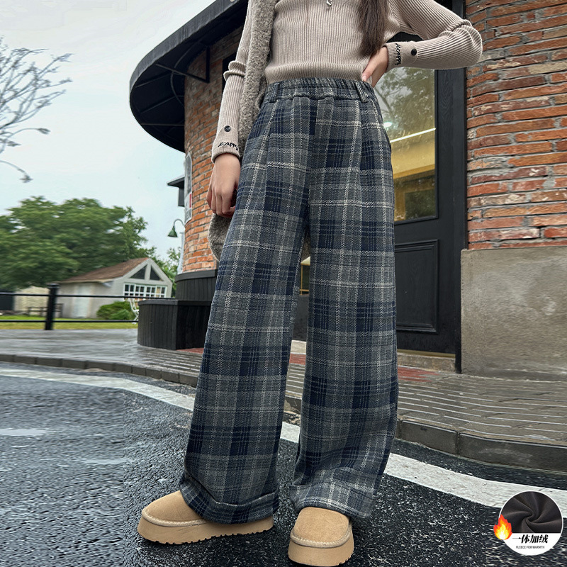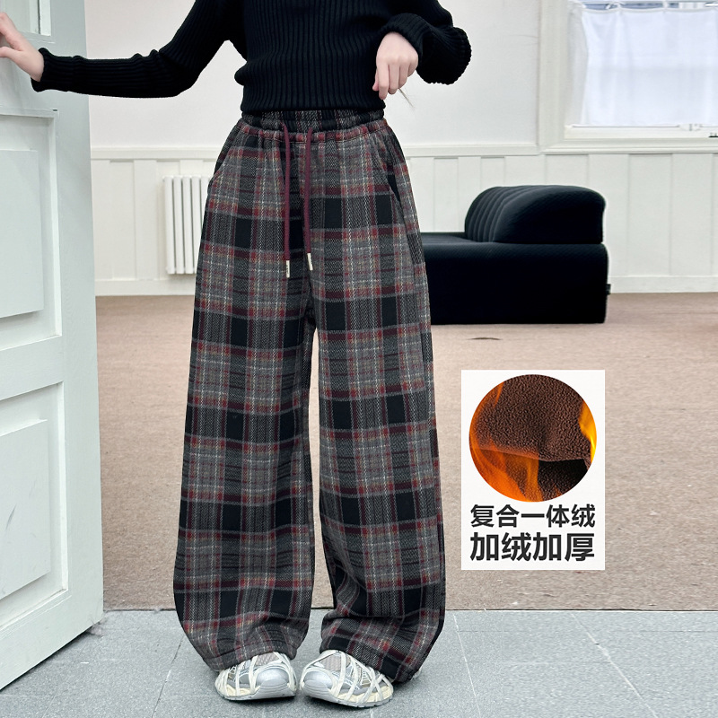 女の子のベルベットの格子縞のズボンは冬の2024の新サイズの子供の冬の服装のストレートで厚い一体のベルベットのズボンのワイドパンツです