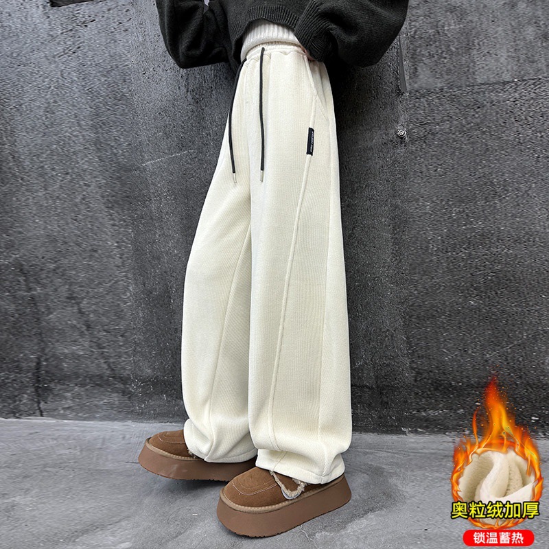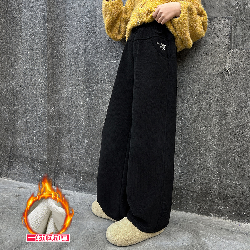 女の子のストレート筒とベルベットのカジュアルパンツ2024秋冬の新型の子供の女の子のワイドパンツが一体になって厚くなった