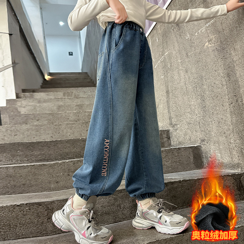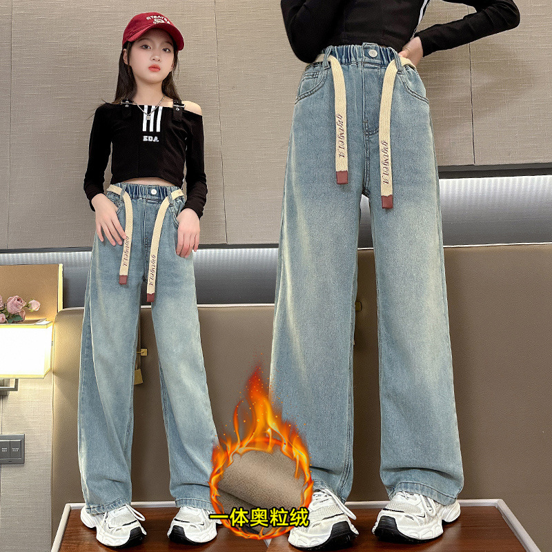 女の子とベルベットのジーンズ秋冬2024の新しい秋の子供のズボンの女の子の冬の服装の広いズボンのゆるい子供