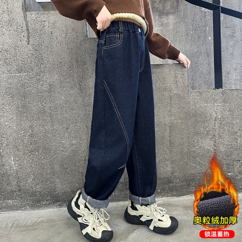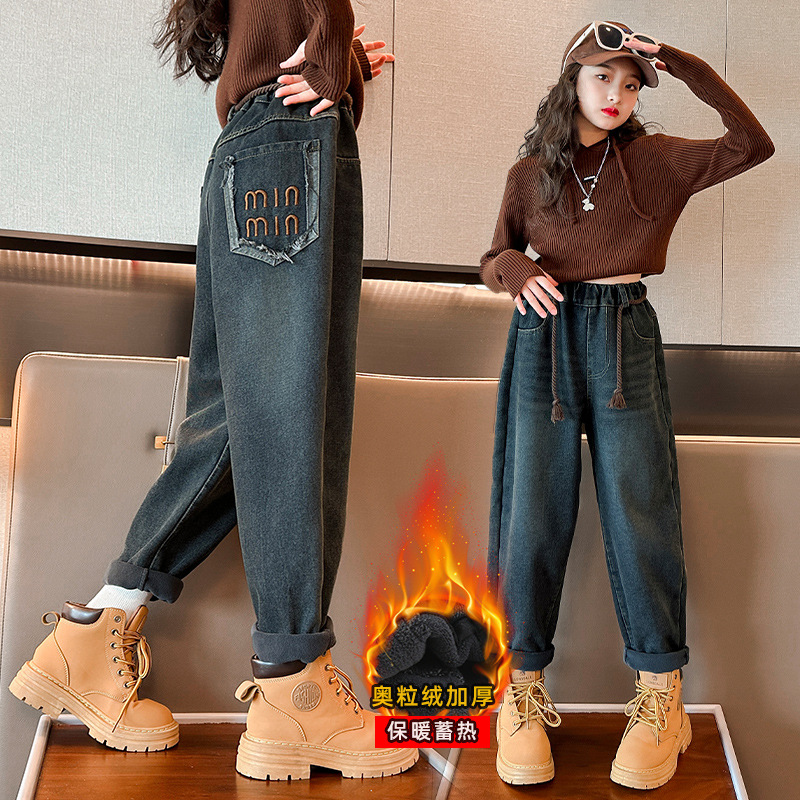 女の子のきれいな色のデニムのお父さんのズボンの女性の大きい子供の2024秋冬は厚いハーレムのズボンの子供の冬の服装をプラスして長いズボンをプラスします。