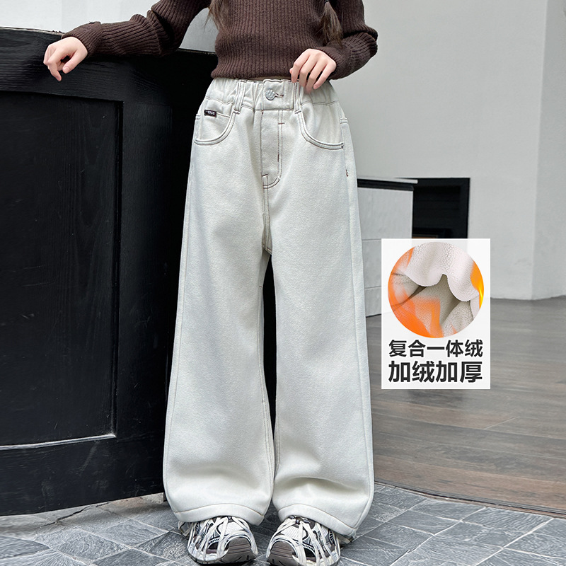 女の子のベルベットジーンズ秋冬服の新しい洋気広脚ズボン子供のゆるい一体ベルベットのストレートズボンのズボン
