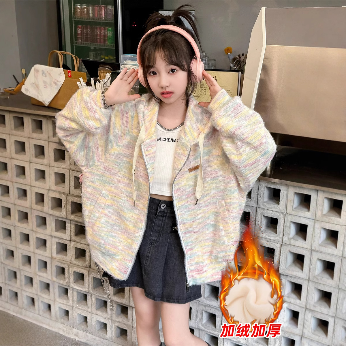 女の子のコート春秋タイプ2024の新しい秋の服は帽子と秋冬の洋風のファッション的なファッションとベルベットが子供の子供を厚くしている