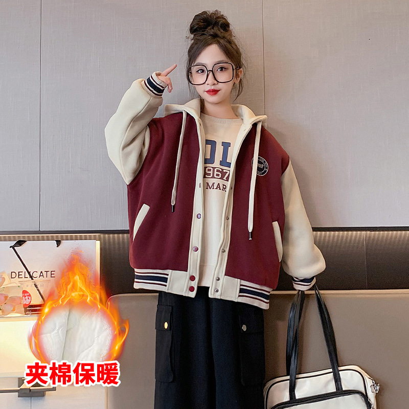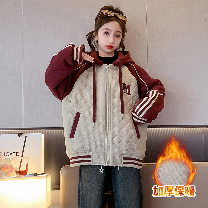 女の子コート秋冬金2024新洋風増厚11歳12大児童13帽子15女子野球服