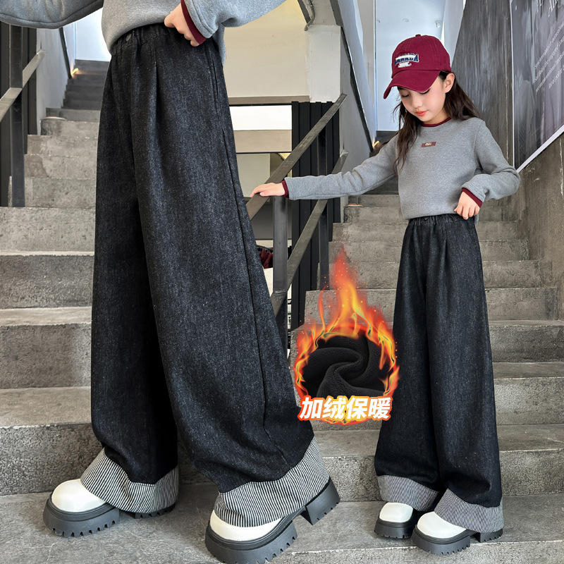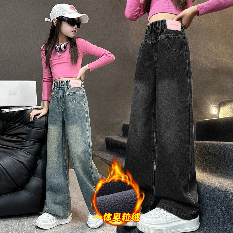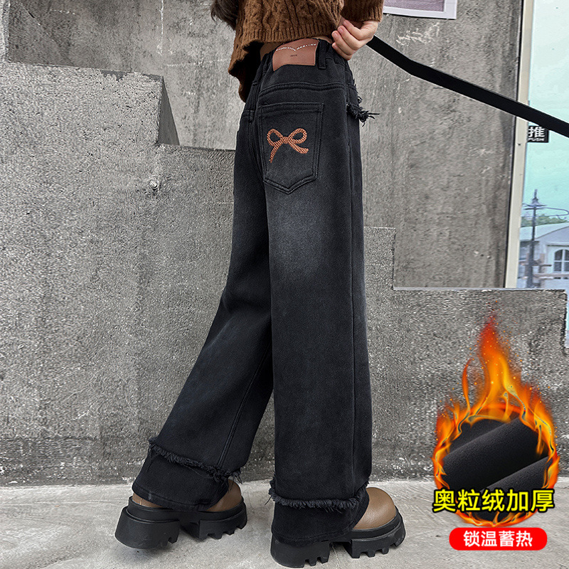 女の子のベルベットジーンズ秋冬服の新しい洋気広脚ズボン子供のゆるい一体ベルベットのストレートズボンのズボン