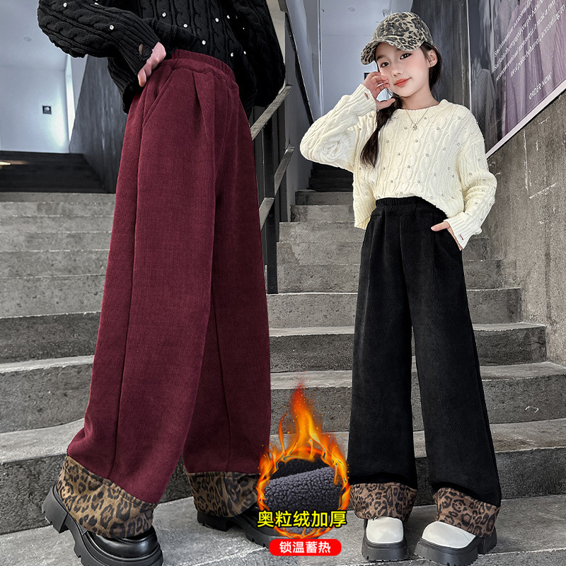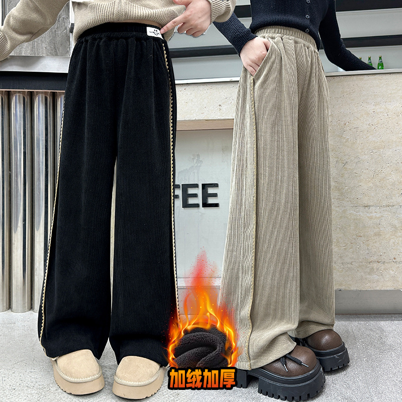 女の子のズボンは秋冬の外で2024の新型の子供のコーデュロイの広い足のズボンとベルベットの厚い一体のベルベットのカジュアルなズボンを着ています