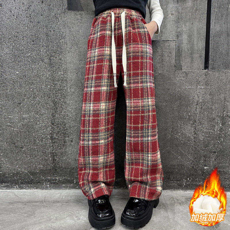 女の子とベルベットの厚手のズボン秋冬金2024の新しい洋気の中の子供のカジュアルなゆるいストレートの格子縞のズボン