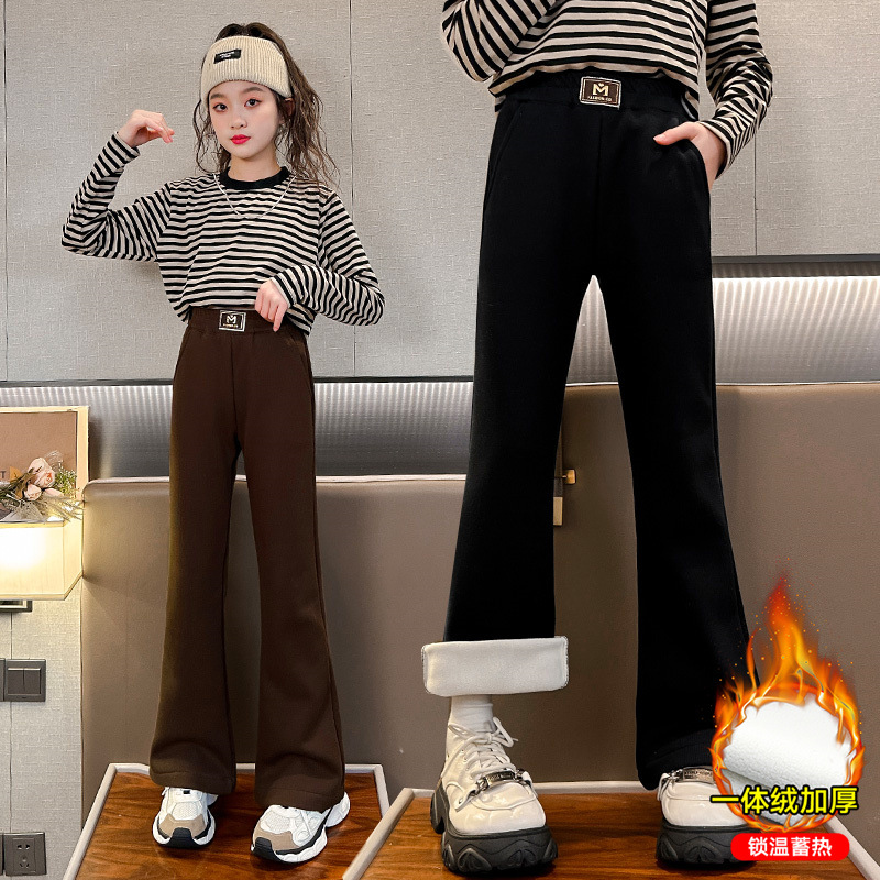 女の子のズボンの秋の2024の新型の子供の春と秋の冬の女の子の一体の子羊の毛のズボンは厚いラッパのズボンの洋風をプラスします。